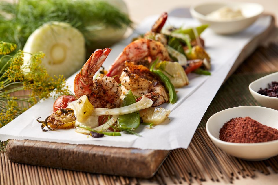 - Heat 2 large frying pans over high heat. Add some ghee to the pans. When hot, place 12 prawns in each pan and season. Sear prawns for 40 seconds, then turn over. Sprinkle generously with sumac, and cook for another 20 seconds. Deglaze pans with verjuice and reduce cooking liquid for 10 seconds.