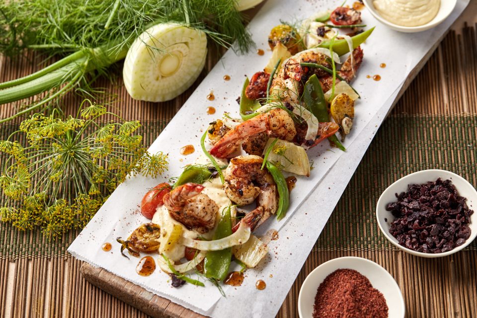 - To plate the dish, place some fennel puree on a plate. Scatter plate with cherry tomatoes and roasted fennel. Place 6 prawns on each plate, saucing with cooking liquid from the pans. Add blanched snow peas, samphire and sprinkle olive crumbs over the plate. Drape with shaved fennel and snow peas. Dot fennel fronds over dish, sprinkle with fennel pollen and serve.