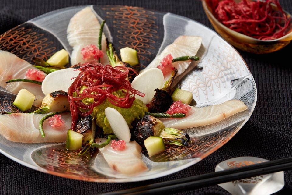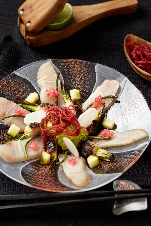 6. Dot plates with Avocado puree and chargrilled Turnips. Drape Kingfish pieces over turnips and around the plate. Dress Kingfish with Finger Lime caviar, verjuice and season with sea salt. Scatter Cucamelon, shaved Turnips, Sea Blight and Seaweed around plates. Squeeze lime juice over the dish. Drape Red Elk over components, dress with smoked Olive Oil and serve.