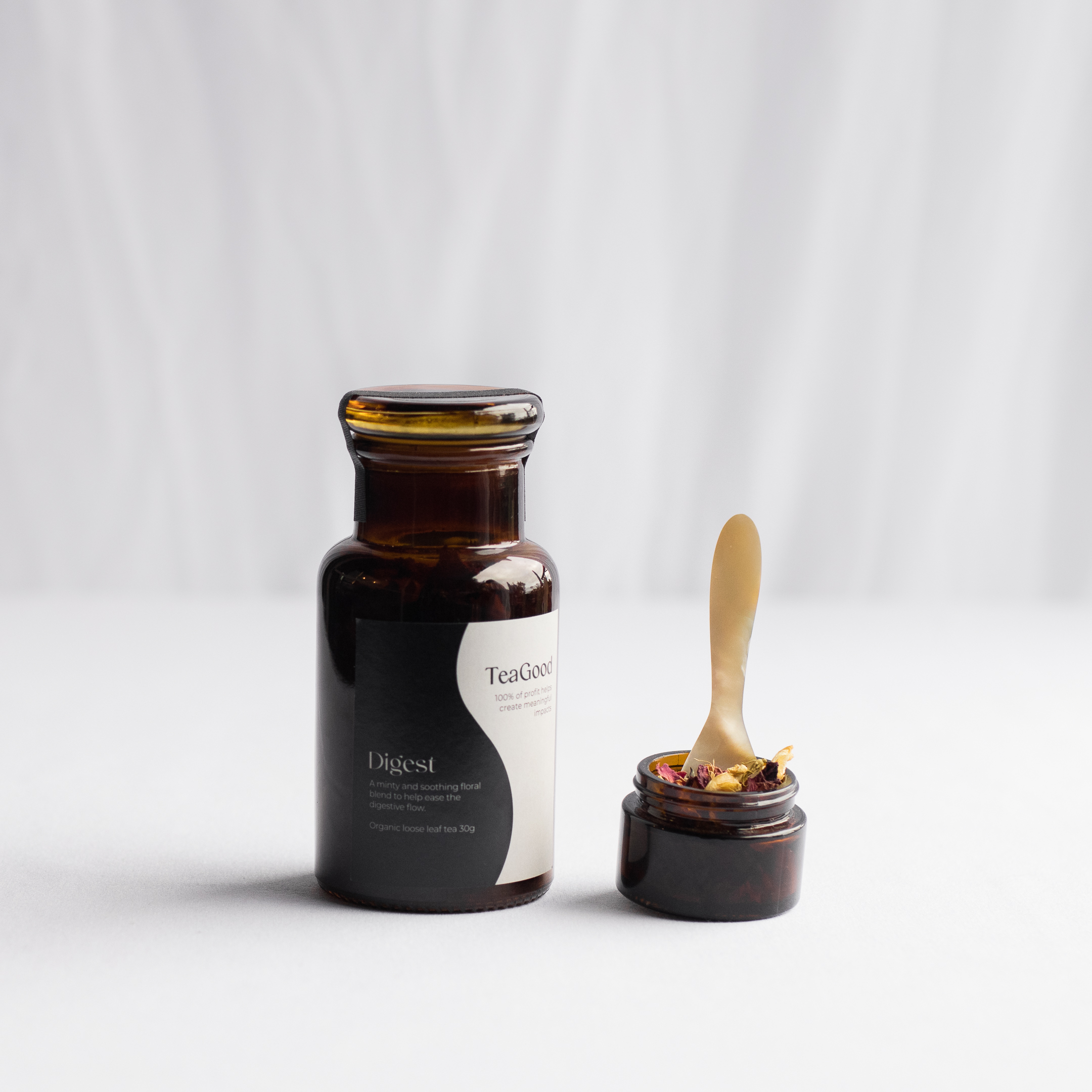 A minty and soothing floral blend to help ease the digestive flow. Organic loose leaf tea, 55g, created by social enterprise TeaGood. Peppermint: is one of the most known plants for easing the digestive system. Its leaves contain compound essential oils including menthol, menthone and limonene which may help to relax digestive muscles, relieve intestinal colic and flatulence, support digestion and may relieve certain types of headaches. Rose Petals: have been used for centuries in the Middle East to help improve digestion and soothe the uncomfortable stomach. Rose petals have a mild laxative effect that can help to ease the digestive flow and have been known as a herbal remedy for preventing constipation and diarrhea. They also contain pectin that may help bind with fat and cholesterol in the intestines removing them before they are absorbed. Juniper Berries: Ancient Greek and Native Americans used juniper berries for digestion concerns including upset stomach, heartburn, bloating, loss of appetite, as well as gastrointestinal infections. Juniper Berries contain bitter compounds that regulate digestion by stimulating bile flow and boosting the production of stomach acid secretions and digestive enzymes. Orange Peel: in Chinese Medicine theory bitters ingredients like orange peel tend to have a cleansing action on the body by clearing heat, drying dampness and promoting elimination via kidneys/urination or bowel movements. Orange peel is rich in copper, calcium, magnesium, folate, vitamins A and B, and dietary fibre that help to stimulate the digestive system, improve the absorption of nutrients from the food, fight acidity and may promote fat burn. Caraway Seeds: have been known since antiquity. In fact, caraway remains one of the oldest herbs and medicinal plants. During the Middle Ages, people consumed caraway as a digestive aid after a big feast to prevent bloating and other digestive issues. In Germany, caraway has a long tradition as the best herbal remedy for dyspepsia (indigestion) and intestinal cramps. The nutrients in the seeds stimulate the secretion of gastric juices, improving the circulation of blood and intestinal mucus through the stomach. This helps to regulate bowel movements, relieve digestive cramping and spasms, prevent bloating and flatulence.