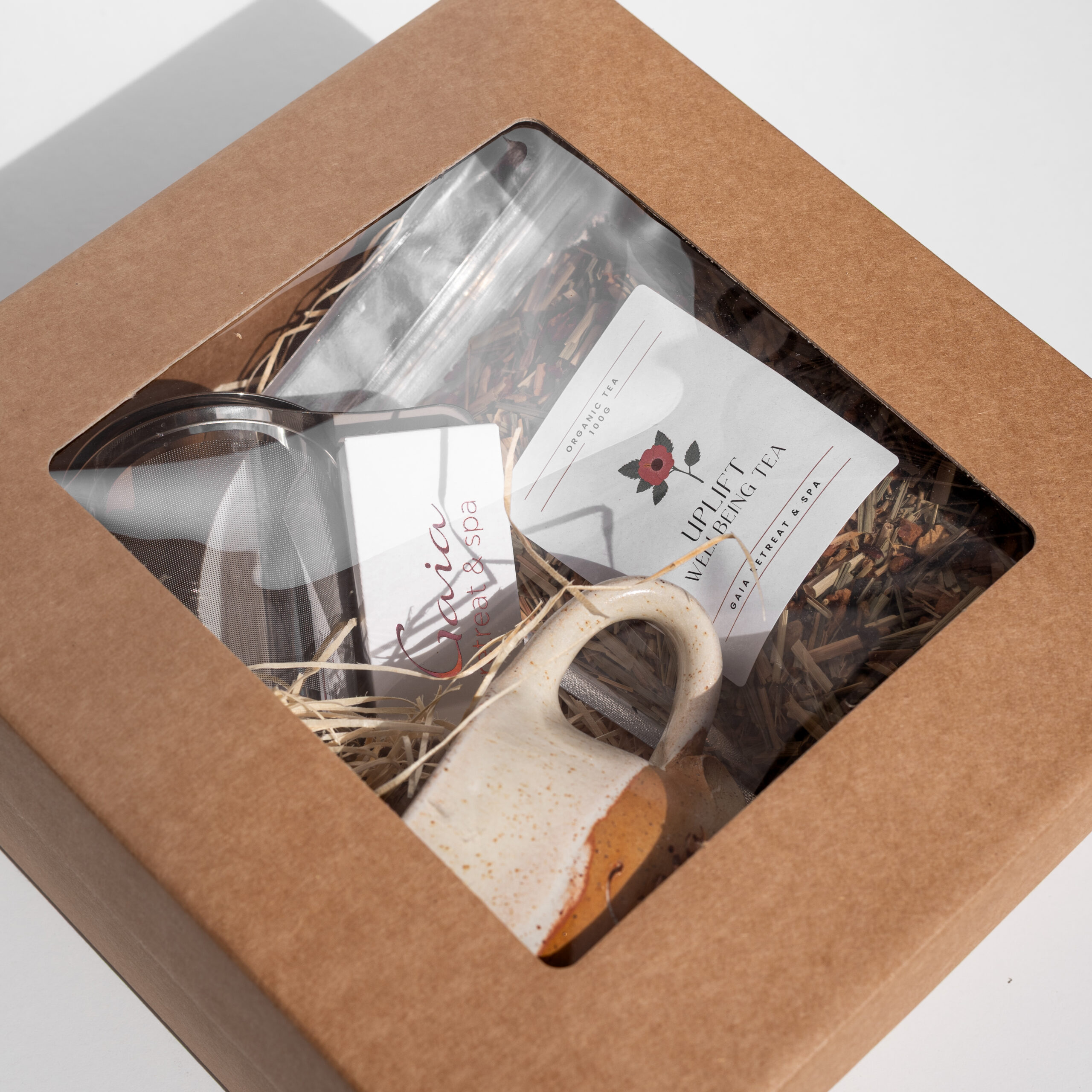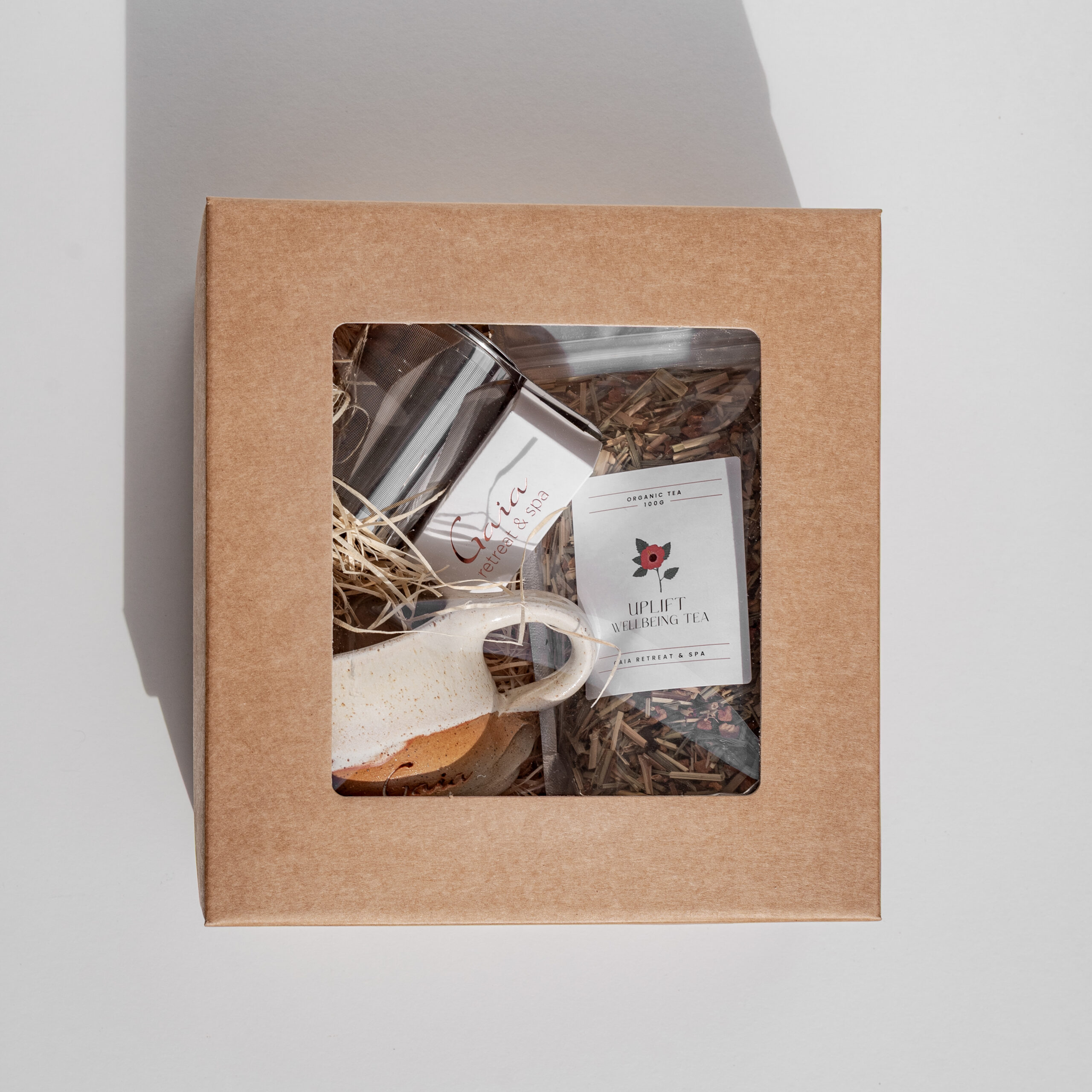 A complete tea ritual in one beautifully presented set. This curated pack features our Gaia Uplift Wellbeing Tea, a handcrafted Brooke Clunie mug, a tea strainer and Gaia chocolate. This combination invites you to pause, breathe and savour the simple pleasure of a warm cup. A comforting and uplifting gift for someone special or a lovely treat for yourself.