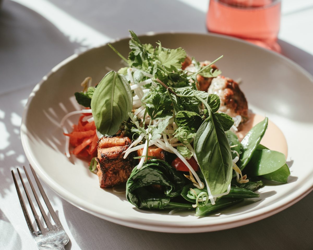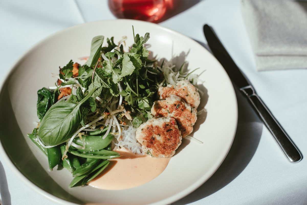 Thai fish cakes with macadamia satay, rice noodles and green mango salad.