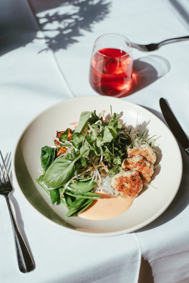 Thai fish cakes with macadamia satay, rice noodles and green mango salad.