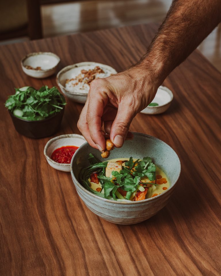 This curry is best served with prawns, eggplant, rice and green beans. However, it is also great with tofu to make it vegetarian. Additionally, a salad garnish made from green mango, bean sprouts, and coriander makes for a refreshing and light touch to the curry. Lastly, add a lime wedge, a spoonful of Gaia Thai Chilli Jam or Gaia Lemongrass Chilli Sambal and sprinkle with fried shallots and cashews.